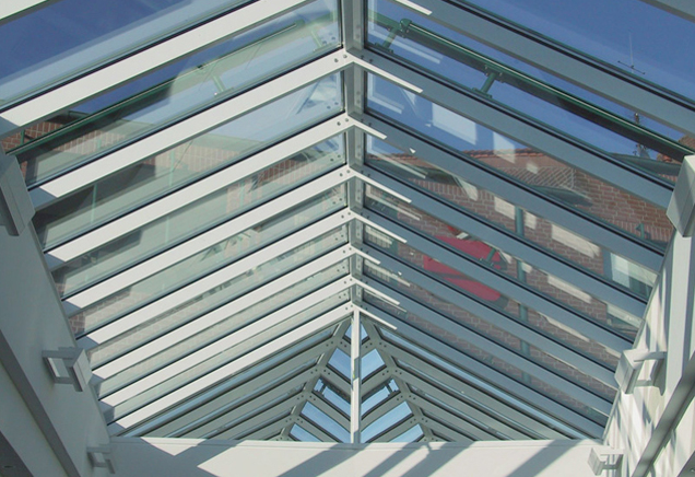 Zwischendach Stahl verzinkt und grau Beschichtet, Glaseindeckung, Firstausbildung