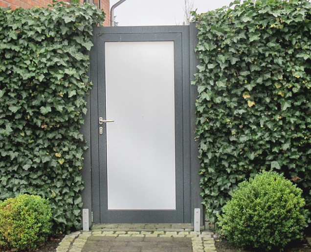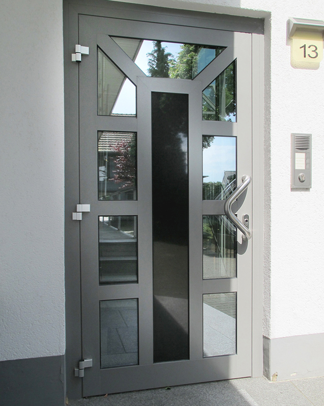 Haustür Aluminium grau, Sprossen, Glas verspiegelt, Granitfüllung