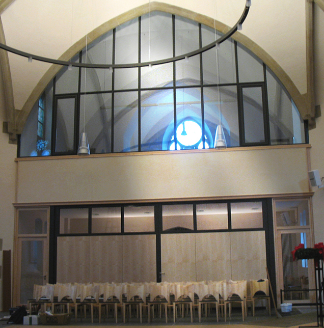 Emporenverkleidung, Stahl und Glas, gothischer Bogen