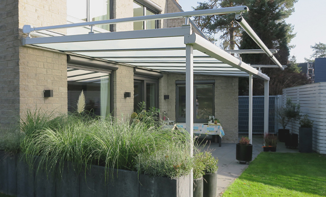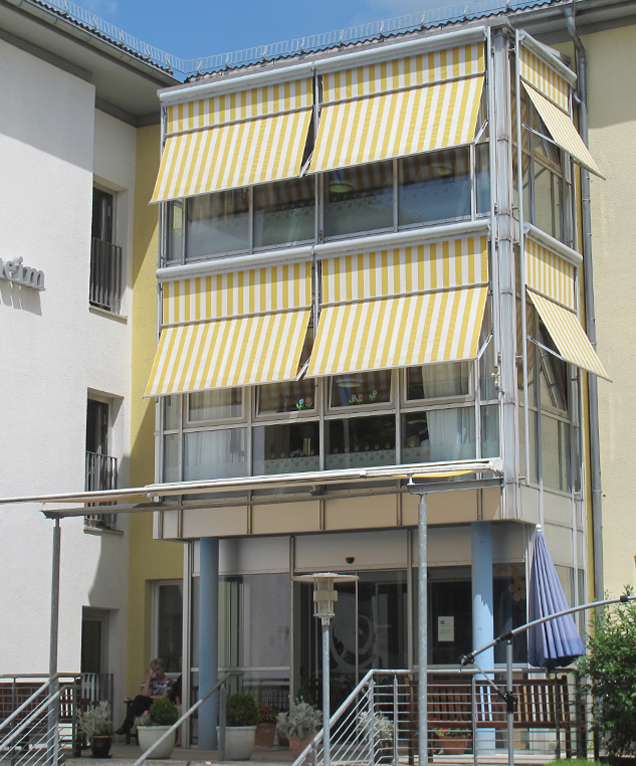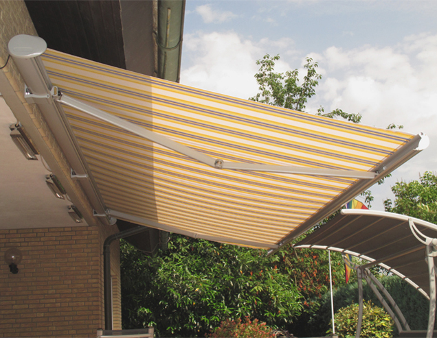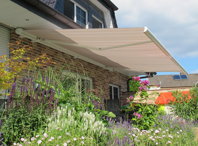 Terrassenmarkise, farbig gestaltet mit Kassettengehäuse
